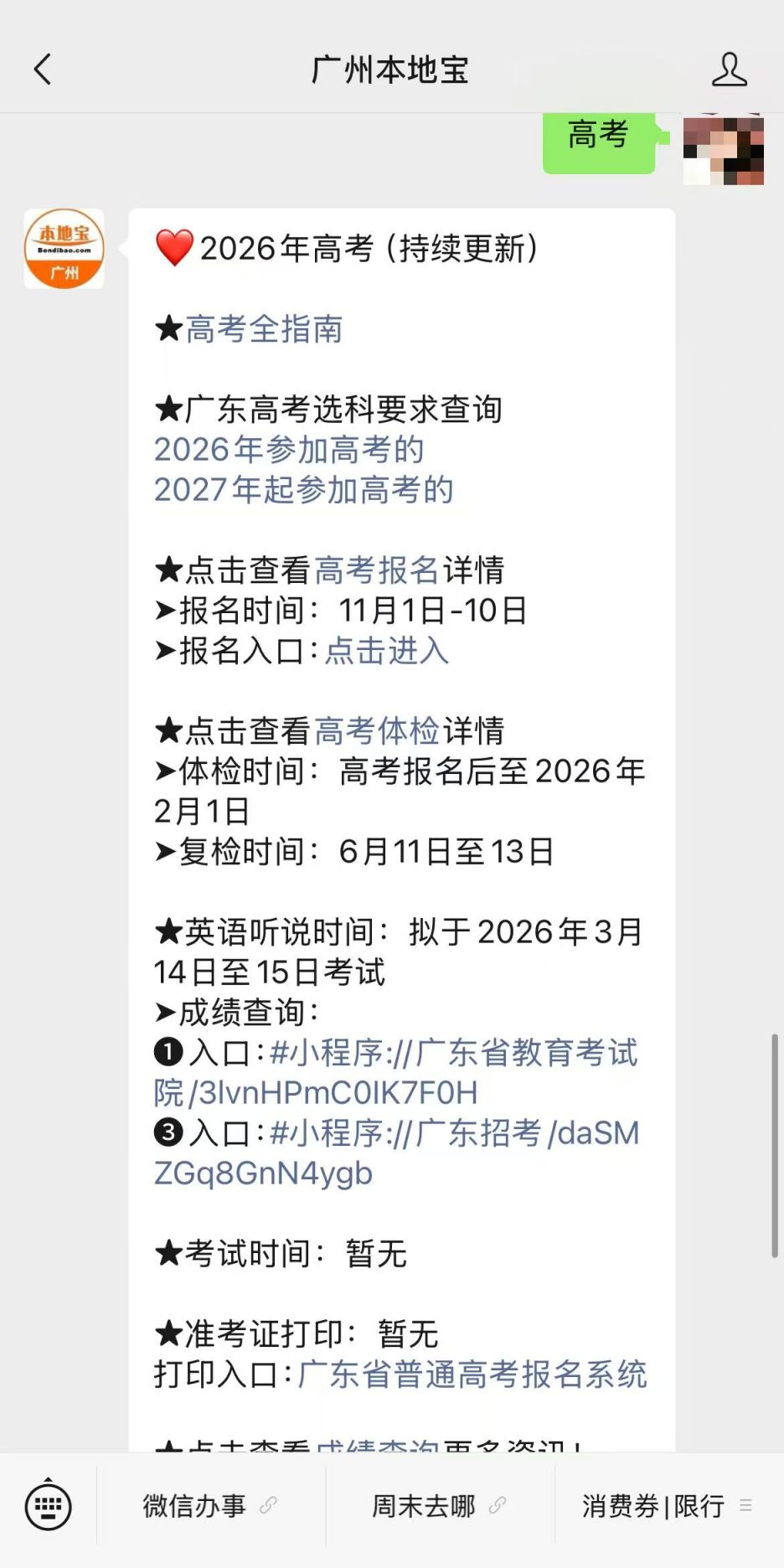 温馨提示:微信搜索公众号【广州本地宝】,关注后回复【高考】,查看2026年广东高考选科要求、高考报名时间+入口、高考体检时间+结果查询入口、及后续的考试时间、成绩查询、往年分数线查询等!